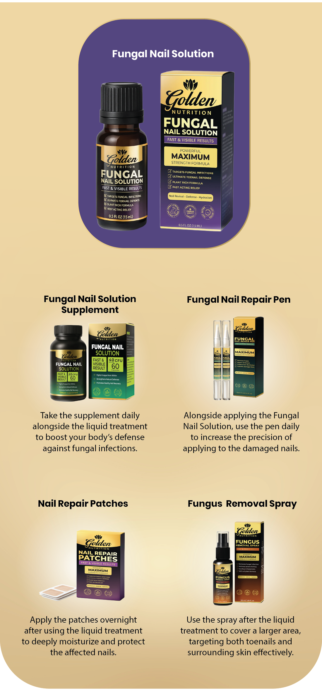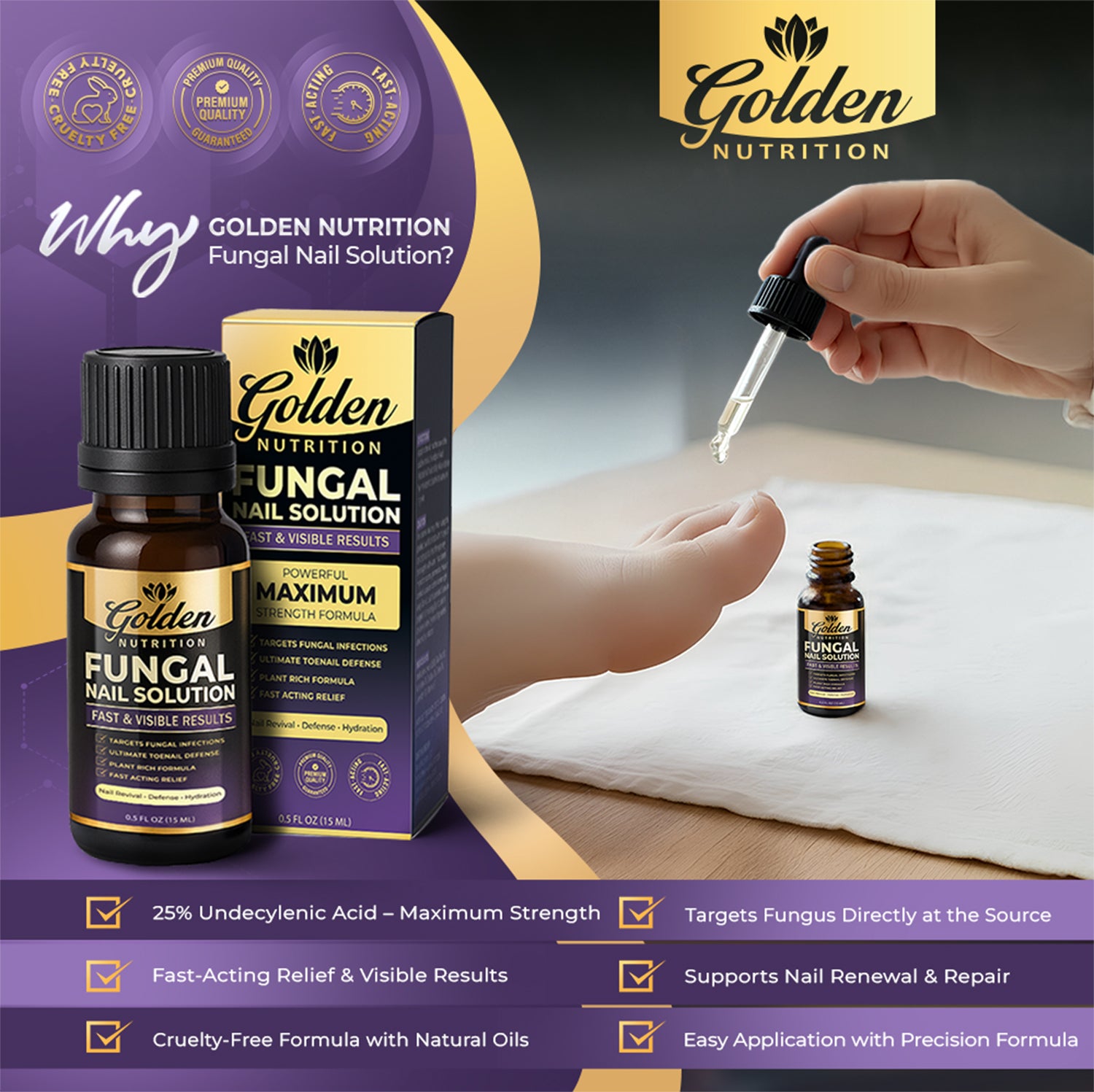 Golden Nutrition’s fungus treatment is a fast, easy-to-use way to address nail fungus at home. Our formula uses ingredients selected for their antifungal and nail-support benefits and is crafted in a quality-controlled facility. It’s designed to penetrate the nail surface, reduce visible signs of fungal infection, and support the look of clearer, stronger nails with consistent use.