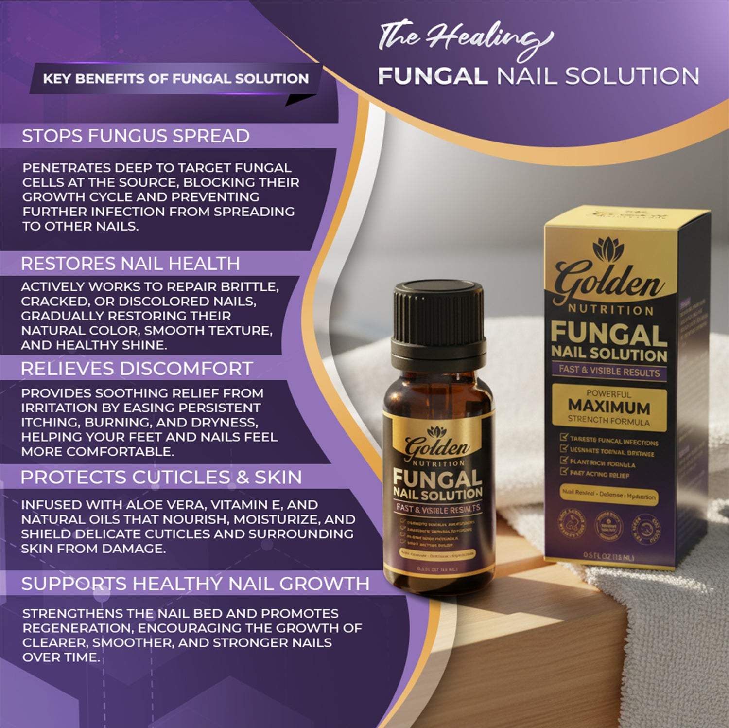 Golden Nutrition Fungal Nail Solution is a topical antifungal liquid that is designed to treat toe and foot fungus. It eliminates fungal infections on the skin around cuticles, nail edges, nail tips, and between the toes.